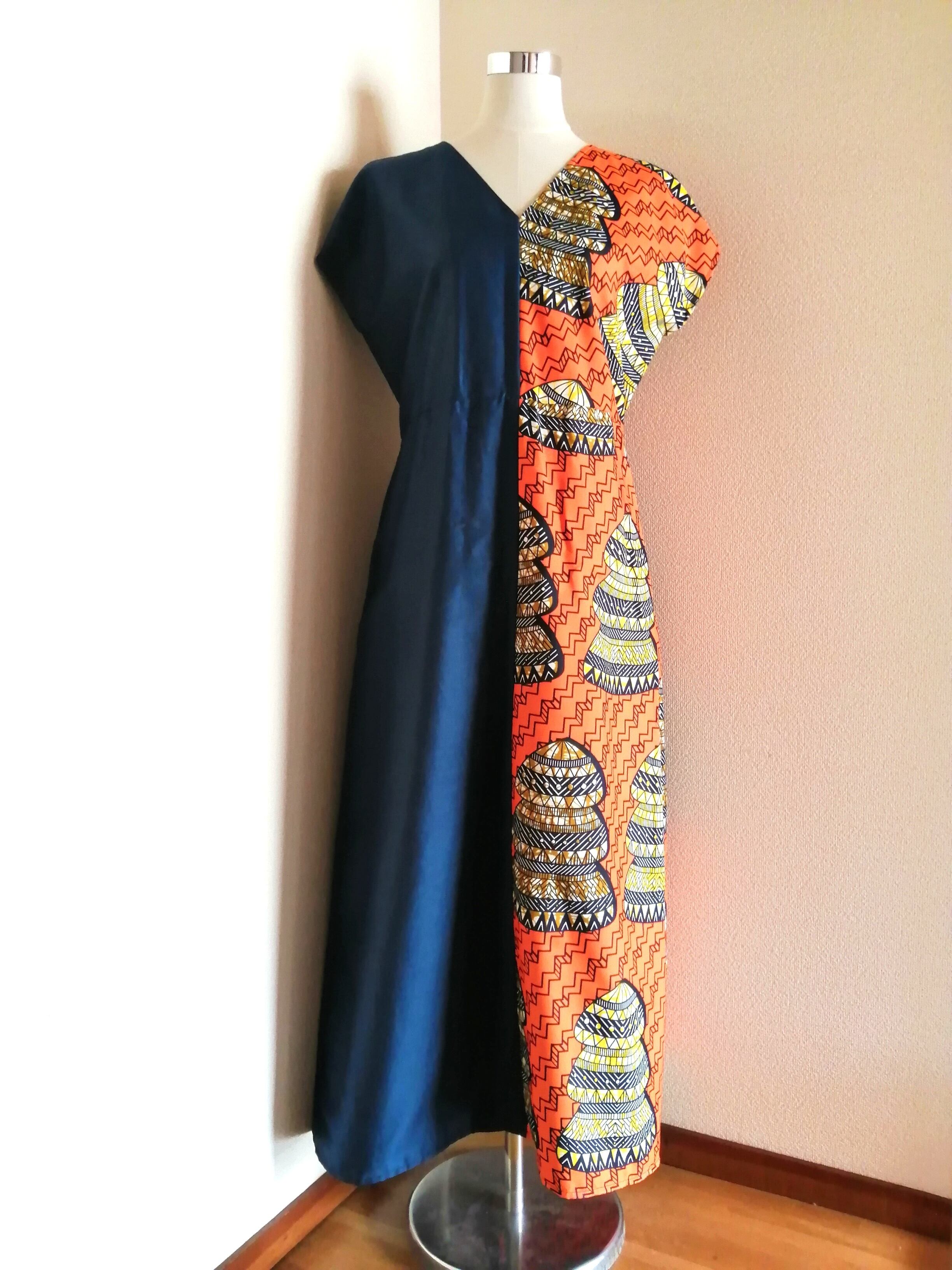 アフリカ布と紺色の布、左右違う布で製作した