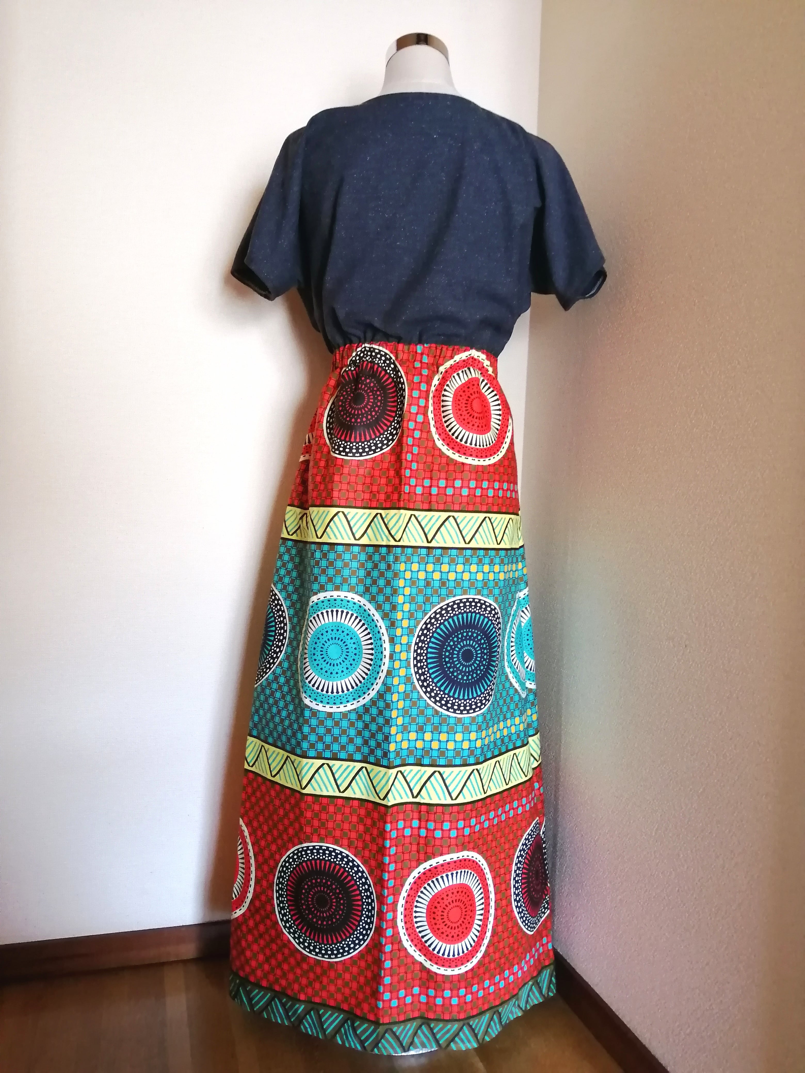 アフリカ布とデニム生地のワンピースです。