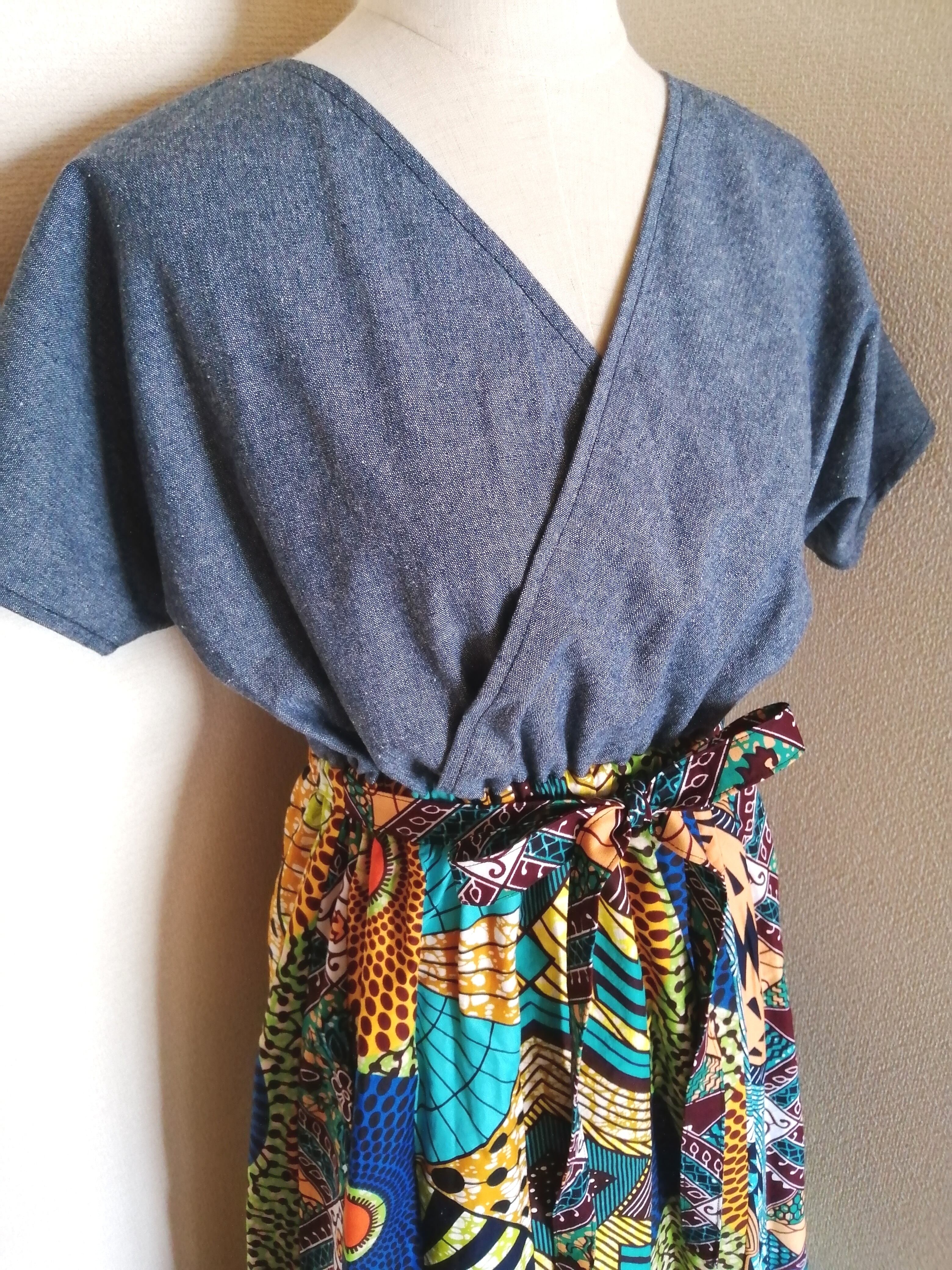 アフリカ布とデニム生地のワンピースです。